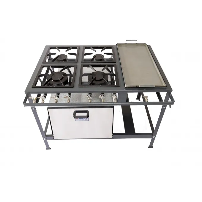 - Queimadores trazeiros simples em ferro fundido de 110 mm de diâmetro.